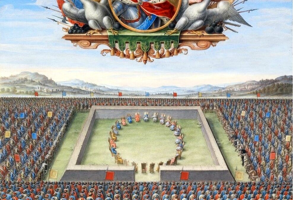 „Cechy we wszystkim moderunku […] i trębaczów dwóch, kupczykowie na koniach pod barwą w sukniach szarych ze sztandarami swymi i szpadami gołymi. Znów trębaczów dwóch, kupczykowie konno i barwisto w koletach z granatowymi wyłogami, z pałaszami dobytymi”.